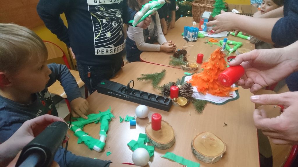 Dnia 20 grudnia 2019 r. w najstarszych grupach przedszkolnych Skrzaty i Pszczółki odbyły się warsztaty bożonarodzeniowe – zajęcia otwarte dla rodziców i ich dzieci. W miłej, świątecznej atmosferze wielu rodziców naszych przedszkolaków odkrywało swoje talenty plastyczne, a dzieci zamieniły się w prawdziwych artystów, wykazując przy tym wiele pomysłowości i kreatywności. Przy dźwiękach kolęd, z pomocą rodziców oraz wychowawczyń powstawały kolorowe bombki, gwiazdki i stroiki. Był to naprawdę mile spędzony czas, podczas którego dzieci i rodzice wspólnie pracowali, jednocześnie świetnie się bawiąc.
