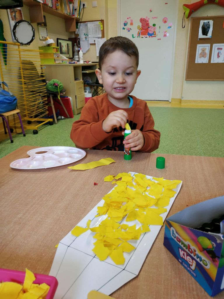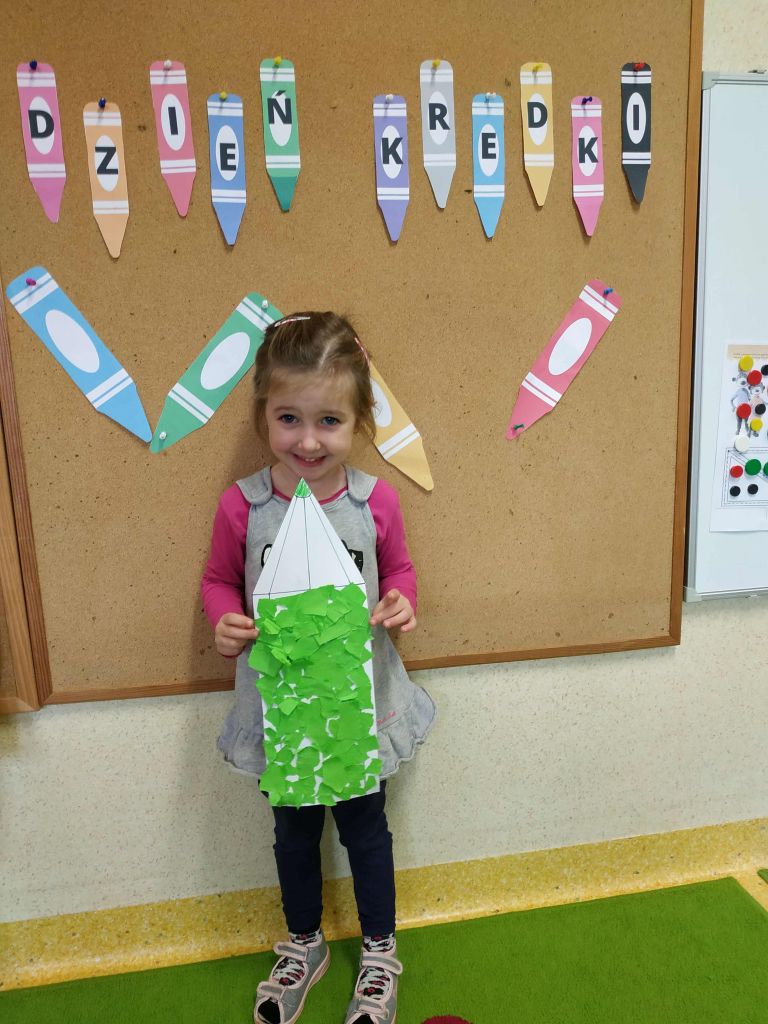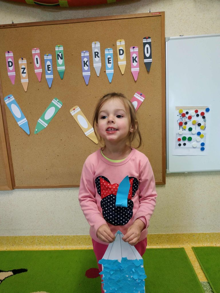 Dnia 23 listopada „Krasnale” świętowały „Dzień Kredki”. Celem zabawy było zapoznanie i utrwalenie kolorów, integracja grupy, kształcenie sprawności manualnych, a także doskonalenie umiejętności liczenia oraz reakcji za sygnał dźwiękowy. Podczas zajęć dzieci wysłuchały wiersza o kredkach i wesoło tańczyły przy piosence „Kolorowe kredki”. Poznały również czym różnią się od siebie kredki świecowe, pastelowe i ołówkowe. Maluszki określały kolory i przeliczały kredki. Tworzyły także kredkowe rytmy, dopasowywały zabawki do odpowiednich kolorów kredek. Wielką frajdą okazało się wykonanie pracy plastycznej z wykorzystaniem wydzieranki z kolorowego papieru.