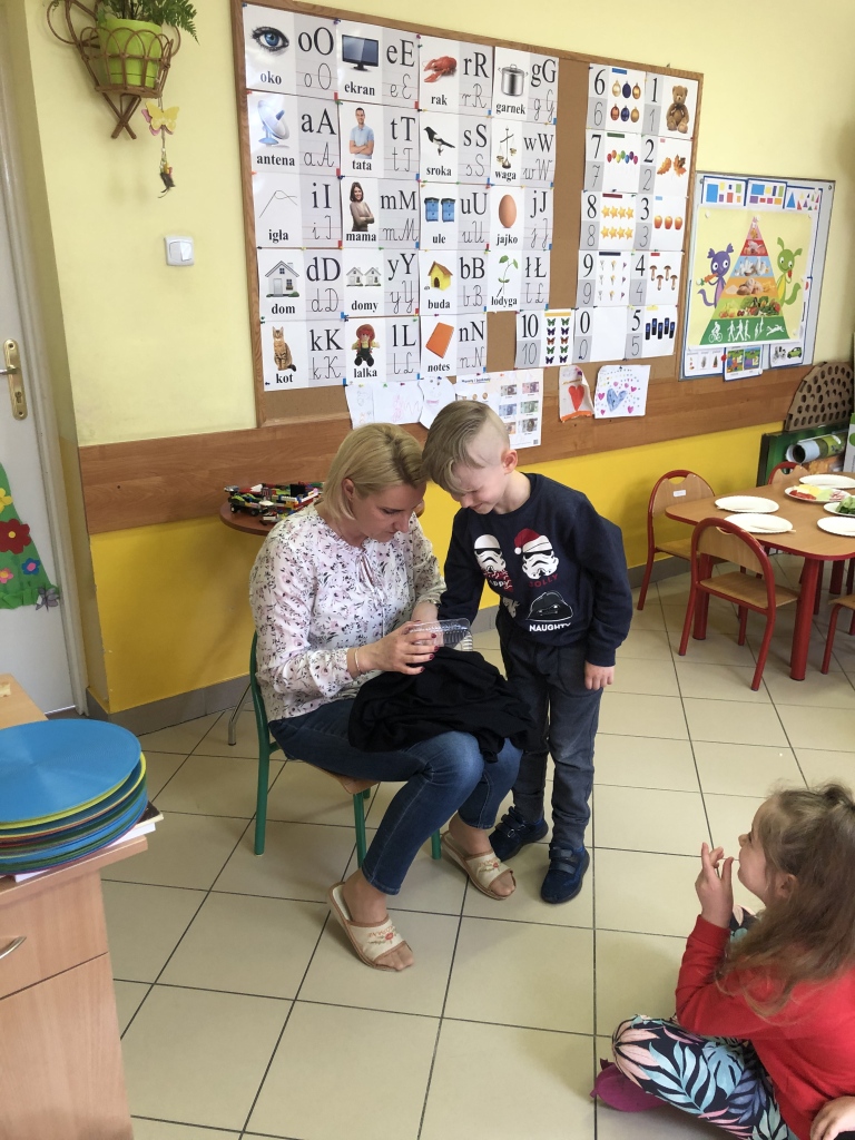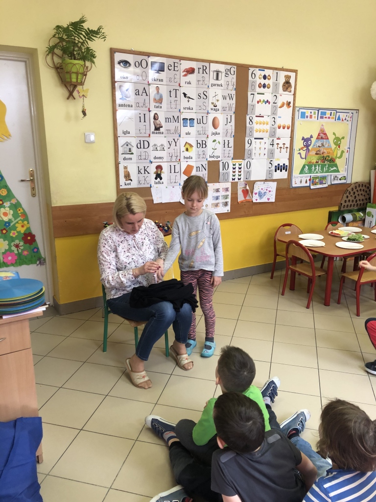 Wspomniany został też oczywiście ,,Chory kotek" S. Jachowicza. Pani Kasia przyniosła również z biblioteki wiele ciekawych i ładnie wyglądających książek kucharskich z przepisami smacznych dań, ciast i deserów oraz książkę w której znalazły się zasady savoir - vivre zachowania się przy stole. Ważnym punktem zajęć była rozmowa na temat zdrowego odżywiania się poparta szerokim przykładem ilustracji. Wszystkie ,,Pszczółki" już od teraz wiedzą, że nadmiar soli, cukru, jak również wysokoprzetworzone jedzenie szkodzi zdrowiu. Wiedzą też, jak ma wyglądać i z jakich produktów powinien się składać codzienny posiłek przedszkolaka. Wiele pozytywnych emocji wzbudziła zabawa w rozpoznawanie produktów spożywczych w oparciu tylko o degustację. Rozpoznawanie smaków i nazywanie tego, co wzięło się do ust bez wcześniejszego zobaczenia jest nie lada wyzwaniem. W trakcie trwania zajęć dzieci doskonaliły koordynację ruchową i zręczność poprzez niesienie na dłoni ,,tacy z posiłkiem" czyli klocka na krążku oraz nazwały przybory używane w kuchni do przygotowywania posiłków. Uwieńczeniem zajęć były własnoręcznie przygotowane przez dzieci kolorowe, wiosenne kanapki z ekoproduktów.