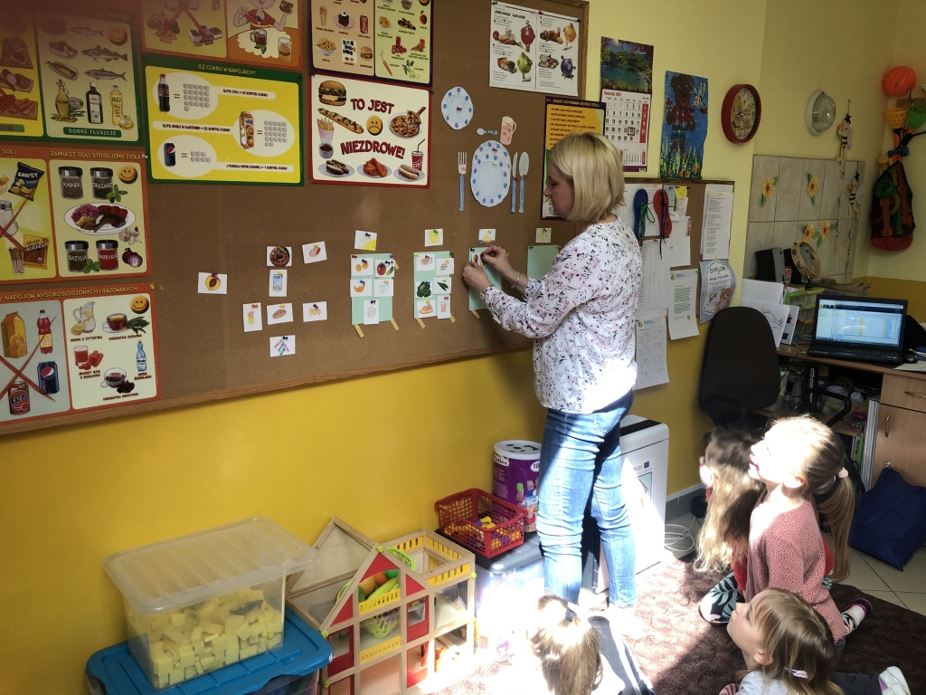 Zajęcia rozpoczęły się od oglądnięcia przez dzieci filmu edukacyjnego o ,,Piramidzie zdrowego żywienia" jako drogowskazu w komponowaniu codziennych jadłospisów. Następnie pani bibliotekarka przeczytała dzieciom utwory związane z konsekwencjami nieprawidłowej diety tj. ,,Łakomczucha" W. Drabika, ,,Bajka o złym barszczu, chciwej babie i mądrej misie" L. Krzemienieckiej.
