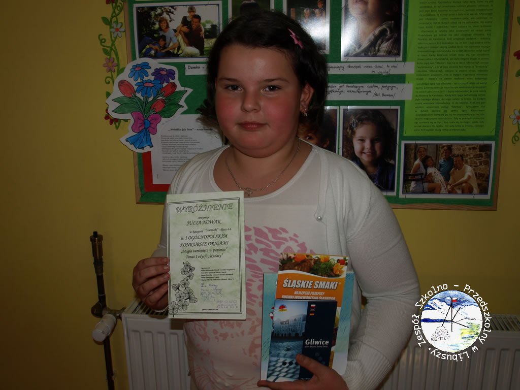 Uczennica naszej szkoły - Julia Nowak z klasy IVa, otrzymała wyróżnienie w I Ogólnopolskim Konkursie Orgiami „Magia zamknięta w papierze”, który został zorganizowany w Bibliotece Publicznej w Gliwicach, pod Patronatem Polskiego Towarzystwa Orgiami.