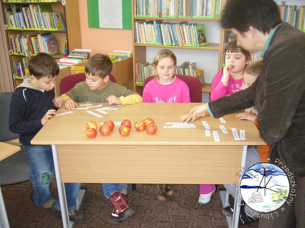 Następnie młodzi ilustratorzy według własnego gustu pokolorowali kominiarczyka i księżniczkę Apolejkę – postacie z poznanej bajki. Podczas omawiania kolorów zastosowanych w swoich rysunkach dzieci smakowały czerwone jabłuszka – symbol zaczarowanego jabłka, które to odmieniło los zaklętego w osiołka królewicza.