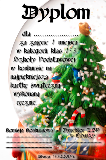 W dniu 11.12.2007r. szkolna komisja wyłoniła laureatów konkursu na najpiękniejszą kartkę świąteczną. W konkursie wzięło udział 46 uczestników. W kategorii klas I-III SP, pierwsze miejsce zajęła Krystyna Pabis z kl. IIa, 2 wyróżnienia: Joanna Karp kl. IIa, Sławomir Lewek kl. Ia. W kategorii klas IV-VI pierwsze miejsce zajęła Natalia Dykas z kl. IVa, 2 wyróżnienia: Wojciech Zawadowicz, Adrianna Śliwa
