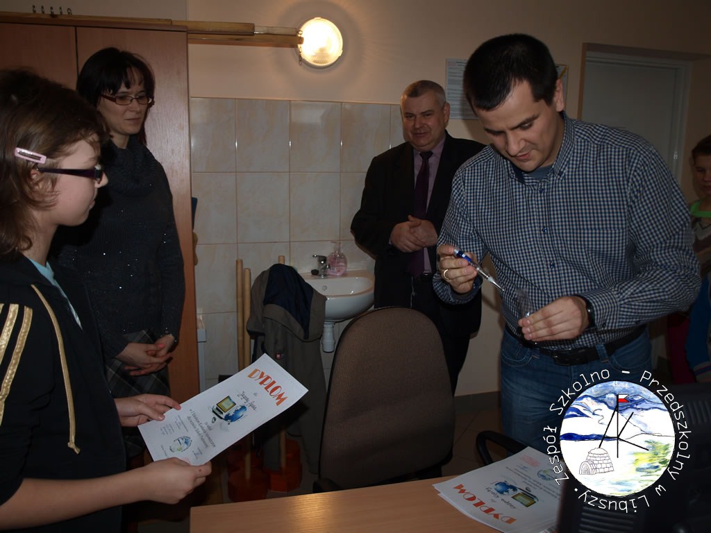 Nagrodami w konkursie były: za pierwsze 3 miejsce Pendriv'y + świecące ledowe długopisy, miejsca IV-X świecące ledowe długopisy. Każdy z uczestników drugiego etapu otrzymał dyplom uczestnictwa a wszyscy uczestnicy niezależnie od etapu i zajętego miejsca wafelki Grześ. Dyplomy wręczał uczestnikom konkursu dyrektor szkoły pan mgr Aleksander Kalisz. Organizatorem i sponsorem nagród rzeczowych był pan Łukasz Stelmach. Wafelki ufundował szkolny sklepik "Bankrut" prowadzony przez panią mgr Renatę Gryboś. Pozostaje nam tylko życzyć uczestnikom coraz większych sukcesów z zakresu informatyki i mamy nadzieje że w przyszłym roku kunkurs będzie się cieszył jeszcze większym zainteresowaniem.