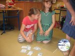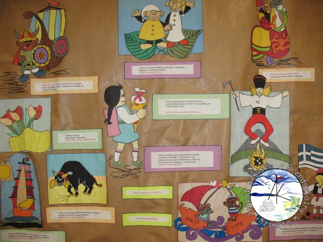 Następnie wybrane przez wychowawczynie trzy osoby, reprezentowały klasę w konkursie wiedzy. Dzieci odpowiadały na pytania dotyczące stolic, zabytków, zwyczajów. Dobierały postaci z bajek do nazw państw, z których pochodzi autor, liczyły ilość euro w kopercie, witały się w różnych językach. Największą trudność sprawiło każdej drużynie ułożenie puzzli - flaga Unii Europejskiej.
