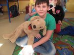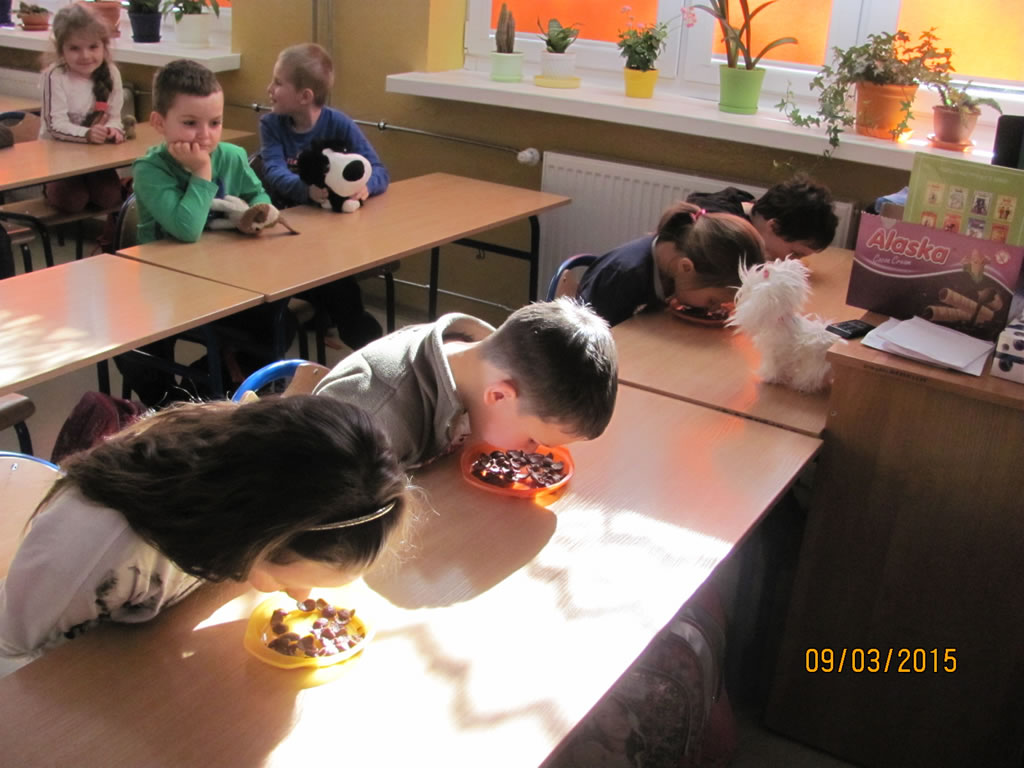 Biletem wstępu na imprezkę był PIES. Dzieci przyniosły maskotki, zdjęcia swoich własnych psów, a niektóre przyszły w koszulkach z pieskiem. Wszystkie dzieci doglądnęły prezentację multimedialną „Psie sprawki”, z której dowiedziały się dużo o psach - zwierzętach i o filmowych. Wybrani uczniowie brali udział w konkursach, w których wykazali się dużą spostrzegawczością i sprytem. Było przypinanie psu ogona z zawiązanymi oczami, odgadywanie jaki to pies po fragmentach odsłanianego obrazka, układanie puzzle z psami. Najbardziej emocjonującym jednak był konkurs, w którym wygrywał ten, kto najszybciej zjadł chrupki czekoladowe bez użycia rąk. Zwycięzcy otrzymali odznaczenia „PSI EKSPERT” i drobne nagrody