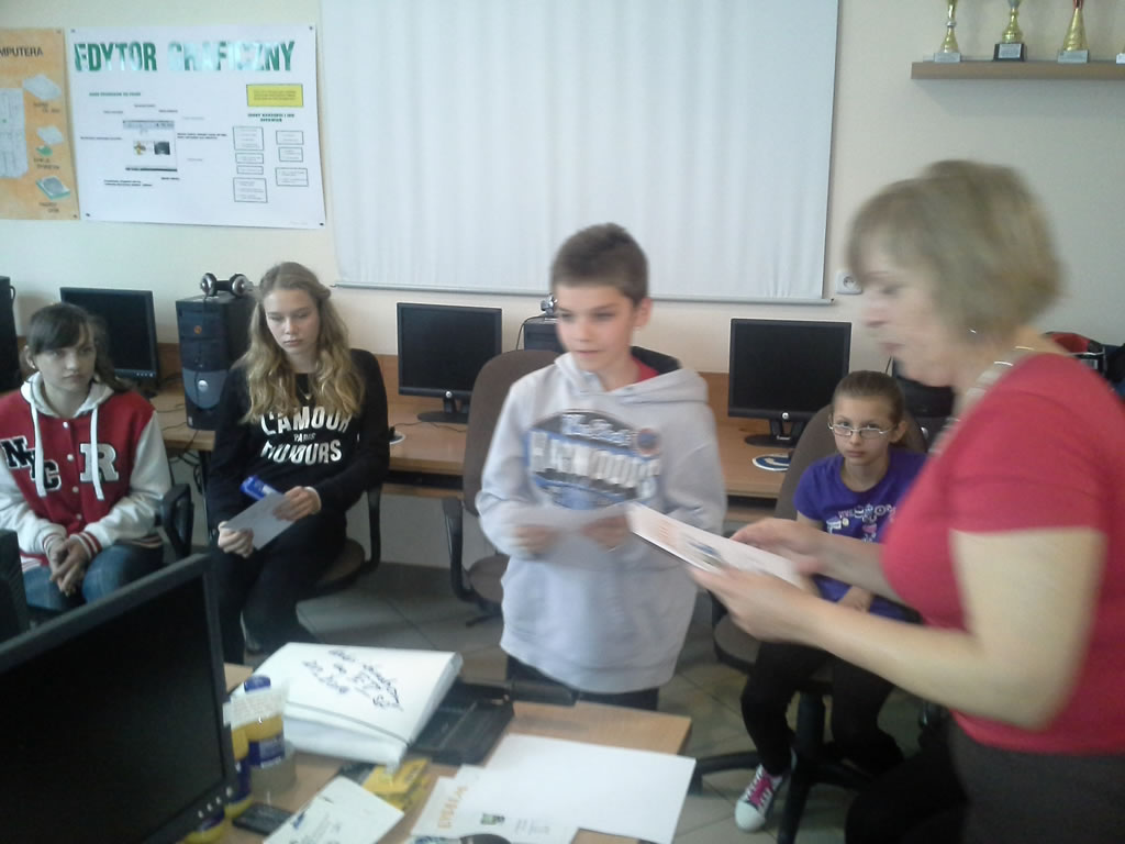 Nagrodami w konkursie były: za pierwsze 3 miejsce Pendriv'y 16Gb + słodki upominek wraz z dyplomem, miejsca IV-X z II etapu jak i pozostali uczestnicy z I etapu otrzymali słodkie upominki i dyplomy uczestnictwa. Dyplomy i nagrody wręczała uczestnikom konkursu pani mgr Mariola Mrozek oraz pan Łukasz Stelmach. Organizatorem konkursu był pan Łukasz Stelmach. Wafelki ufundował szkolny sklepik "Bankrut" prowadzony przez panią mgr Renatę Gryboś. Pozostaje nam tylko życzyć uczestnikom coraz większych sukcesów z zakresu informatyki i mamy nadzieje że w przyszłym roku kunkurs będzie się cieszył jeszcze większym zainteresowaniem.
