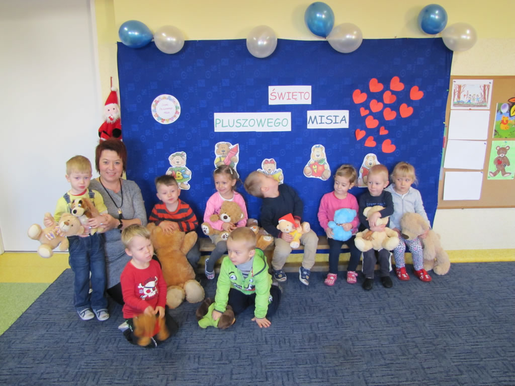 Uroczysty dzień rozpoczął się od układania przyniesionych pluszaków w ,,Krainie Pluszowego Misia’’. Przedszkolaki z grupy ,,Leśnych duszków ‘’ i ,,Pszczółek’’ zostały zaproszone do wspólnej zabawy zorganizowaną przez Panią Mariolę Mrozek gdzie poznały historię święta, wspólnie śpiewały piosenkę o misiach, oraz uczestniczyły w misiowych konkursach.