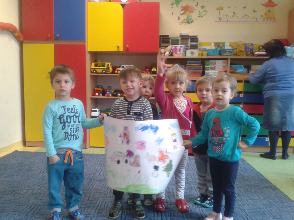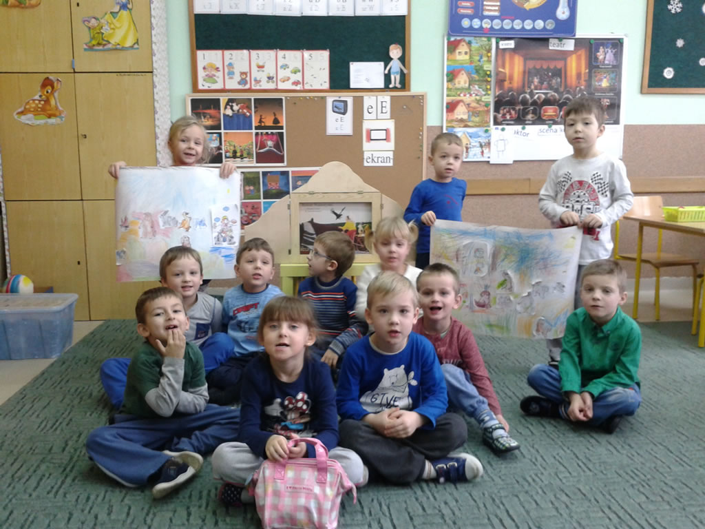 Podczas porannych zajęć przedszkolaki z grupy Krasnale oraz Biedronki miały okazję po raz pierwszy obejrzeć magiczny teatrzyk Kamishibaj. Dzieci wysłuchały historii autorstwa Kumiko Yamomoto pt. „Szukając Marudka” oraz opowiadania Christian Ferrari, Anne Brouillard pt. „Rower Walentynki”. To ostatnie stało się także pretekstem do wspólnej zabawy. Prezentowana w formie obrazkowego teatru opowieść pt. „Rower Walentynki” to historia dziewczynki, która jadąc na rowerku, zabiera w drogę napotkane zwierzątka. Zarówno mali jak i więksi, licząc do dziewięciu, docierają wraz z bohaterką opowieści do jej zaskakującego finału. Po przedstawieniu w grupach powstały autorskie plakaty ukazujące przejażdżkę dziewczynki o imieniu Walentynka. W podziękowaniu za przeprowadzone zajęcia wysłuchałam pięknych piosenek w wykonaniu maluszków.