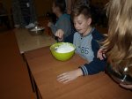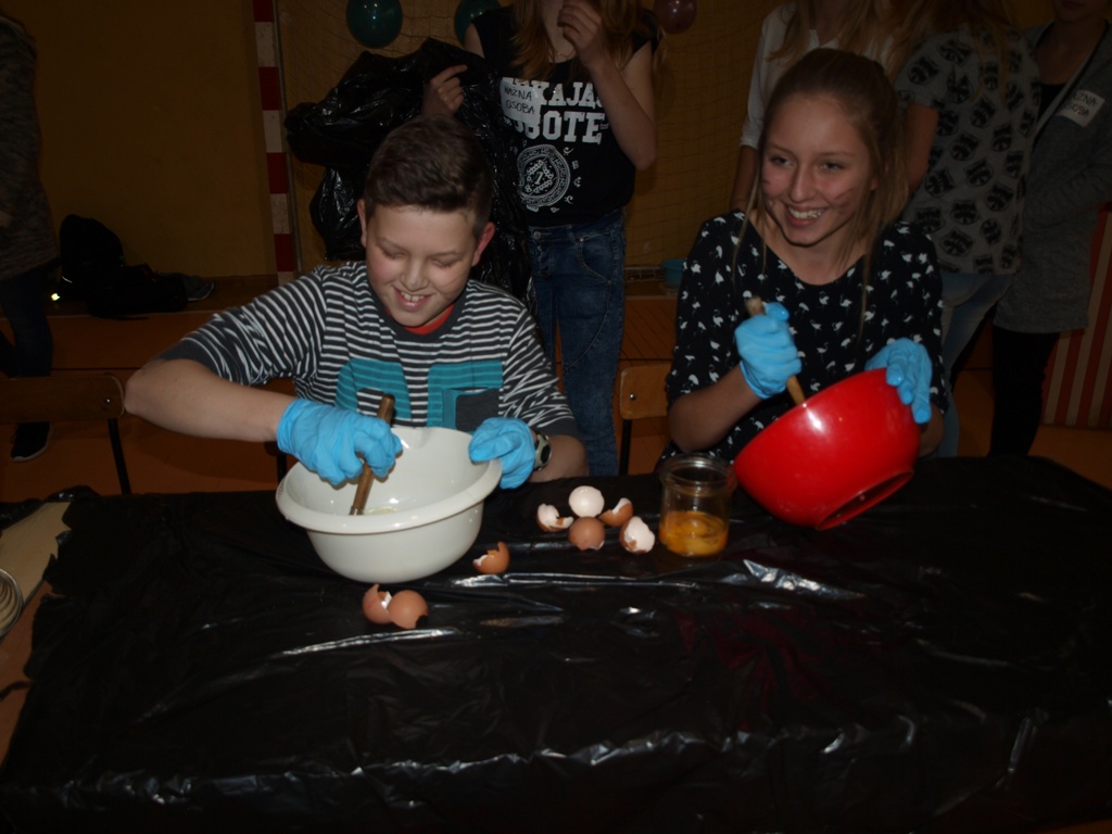 W ostatnim zadaniu znowu musieli poczuć się jak w kuchni, a nie jak w szkole. Mianowicie- "ubijanie białek". Z oddzieleniem białka od żółtka nie było problemu. Ale z ubijaniem? Udało się to tylko jednej osobie. Reszta niestety miała przymusowy prysznic. My zaś jako dobrzy koledzy pomogliśmy im, aby się zbytnio nie ubrudzili.