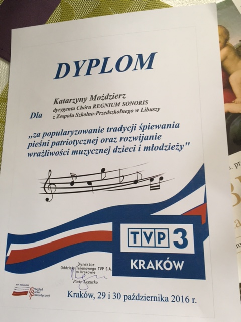 29 października odbył się w Krakowie XIV Małopolski Przegląd Pieśni Patriotycznej pod hasłem „Polska nasze dziedzictwo”. Ponad trzysta osób wzięło udział w tym wokalnym konkursie. Naszą szkołę reprezentował chór Regnum Sonoris. Przygotowanie do występu trwały od początku roku szkolnego. Na planowych próbach oraz wielu dodatkowych chórzyści ćwiczyli nowe utwory. Regulamin przeglądu jest bardzo wymagający. Każdy wykonawca ma przygotować 5 pieśni patriotycznych, w tym jedną skomponowaną po 1945 roku. W tym roku opiekunka chóru wybrała: „Rotę”, „Przybyli ułani pod okienko”, „Wojenko, wojenko” oraz dwie pieśni współczesne „Śpiewa Ci obcy wiatr” i „Jesteśmy krajem chleba”. Utwory okazały się bardzo ambitne i wymagające pewnych umiejętności wokalnych. Z tego też powodu do Krakowa nie pojechali najmłodsi uczniowie z klas czwartych.