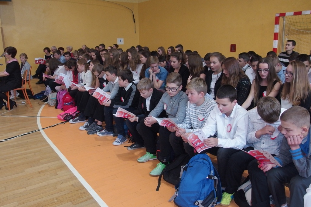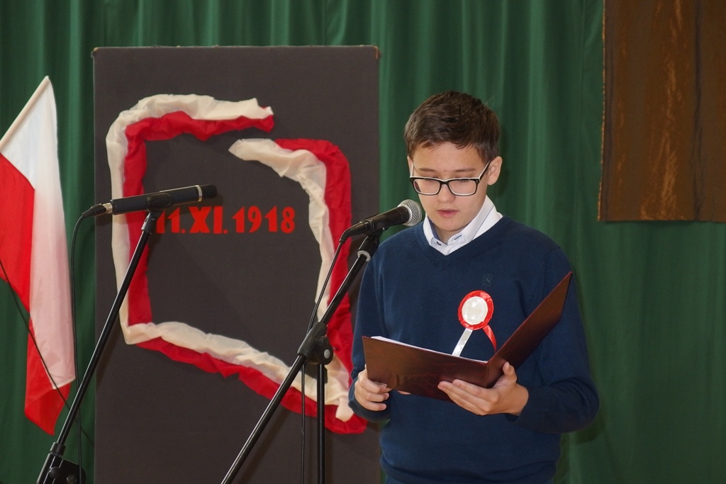 Rocznicę odzyskania przez Polskę Niepodległości obchodzimy w naszej szkole bardzo uroczyście. Już od rana uczniowie przypięli do ubrań biało-czerwone kotyliony. O godz. 10.00 na hali sportowej miała miejsce uroczysta akademia w wykonaniu uczniów kl. I ,II i III gimnazjum oraz szkolnego chóru. Następnie miało miejsce ogólnoszkolne śpiewanie pieśni patriotycznych nierozerwalnie związanych z I wojną światową. Specjalnie na tą uroczystość zostały wykonane śpiewniki, z których mogli korzystać wszyscy uczniowie szkoły. Uroczystość została przygotowana pod kierunkiem p. Renaty Gryboś i p. Katarzyny Moździerz.