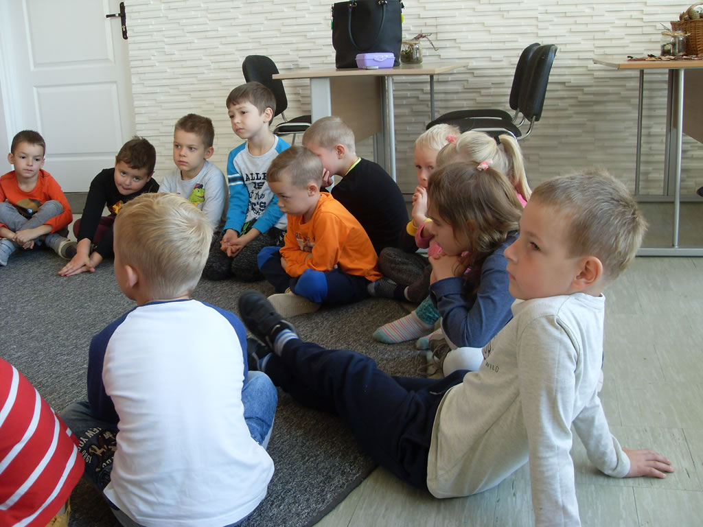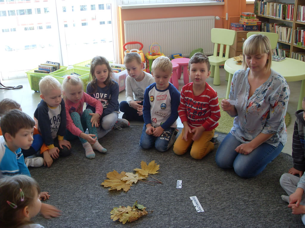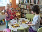 19 października 2017r. dzieci z grupy „Biedronki” udały się do Publicznej Biblioteki w Libuszy, aby uczestniczyć w zajęciach bibliotecznych prowadzonych przez panią Ewelinę Skrzypiec. W pierwszej kolejności przedszkolaki słuchały odgłosów lasu. Nazywały gałęzie drzew i przyporządkowały odpowiadające im napisy. W dalszej części spotkania wysłuchały opowiadania pt. „Jeżyk Cyprian i pierwszy dzień jesieni”. Treść dotyczyła charakterystycznych oznak obecnej pory roku. Przedszkolaki zdobyły wiedzę na temat tego, w jaki sposób rośliny i zwierzęta dostosowują się do zmian następujących w przyrodzie. Kolejnym etapem spotkania było wykonanie prac plastycznych z wykorzystaniem materiału przyrodniczego. Powstały wspaniałe, pomysłowe dzieła: zwierzątka zrobione z kolorowych, jesiennych liści. Dziękujemy pani Ewelinie za zajęcia przeprowadzone w interesujący sposób i czekamy na kolejne zaproszenie do biblioteki.