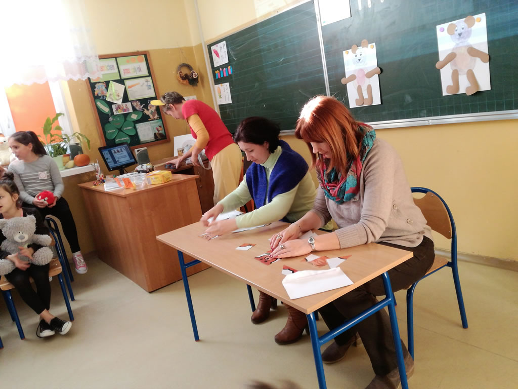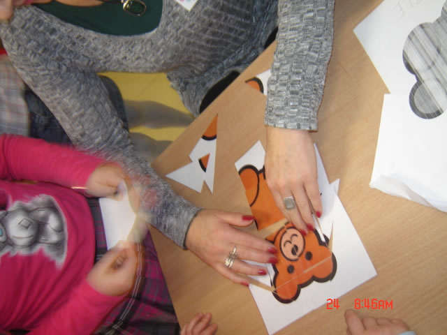 Po tej części rozpoczął się czas zabaw i zgadywanek. W ich trakcie dzieci odgadywały tytuły i imiona bohaterów książkowych. Uczniowie mieli również za zadanie dokleić misiowi uszy, łapki i nóżki z zawiązanymi oczami, nakarmić głodnego misia. Również Panie wychowawczynie miały swoją konkurencję, która polegała na ułożeniu puzzli z postacią misia. No niestety nie było to takie proste. Spotkanie klas pierwszych rozpoczęło się krótkim przedstawieniem o „Złotowłosej i trzech niedźwiadkach” przygotowanym przez przedszkolaczki z grupy „Pszczółki” pod kierunkiem Pani Magdaleny Stelmach. Bardzo serdecznie dziękujemy i liczymy na dalsza współpracę.