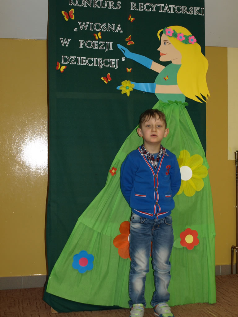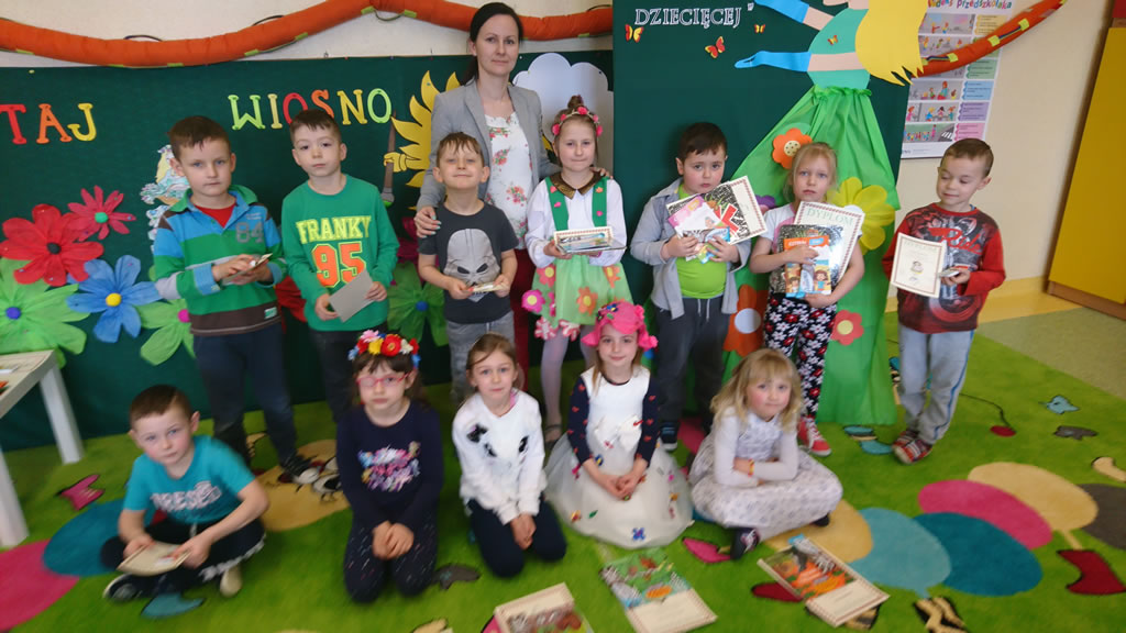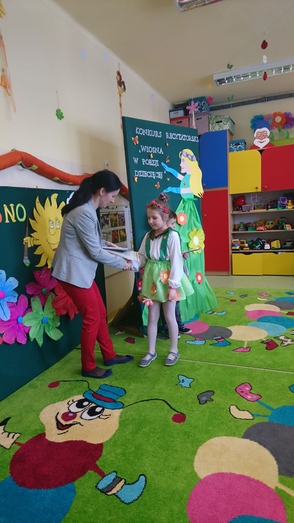 W konkursie recytatorskim, zorganizowanym przez p. Magdalenę Stelmach brały udział dzieci 5, 6 letnie. 16 marca br. dzieci zaprezentowały dowolny wiersz o tematyce wiosennej. Komisja konkursowa w składzie p.Mariola Mrozek, p.Katarzyna Michalec i p.Anna Dykas oceniała pamięciowe opanowanie tekstu wiersza, interpretację utworu, a także ogólny wyraz artystyczny w tym strój. Wyniki konkursu: 1 miejsce: Lena Górska (Leśne Duszki), 2 miejsce: Emilia Komendera (Pszczółki), 3 miejsce: Maciej Dyląg (Biedronki), wyróżnienia: Ola Mrozek (Leśne Duszki), Gabriela Świerz (Biedronki), Emilia Dyląg (Leśne Duszki), Oliwia Wszołek-Tybor (Pszczółki). Laureaci konkursu otrzymali dyplomy i nagrody rzeczowe oraz zaprezentowali swoje wiersze właśnie Pierwszego Dnia Wiosny zgromadzonym przedszkolakom. Wszyscy uczestnicy konkursu otrzymali pamiątkowe dyplomy i „słodkie” nagrody.
