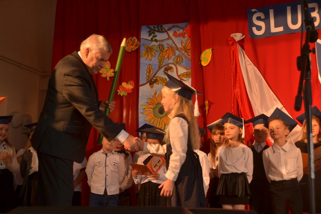 Miło nam poinformować, że 24.X.2018r do grona uczniów naszej szkoły zostały przyjęte dzieci z klas I. Uroczystość odbyła się w Domu Strażaka, w obecności Pana Dyrektora, rodziców, zaproszonych nauczycieli i uczniów klas drugich i trzecich. Na wstępie dzieci zaprezentowały przygotowany program artystyczny, a następnie złożyły ślubowanie, w którym przyrzekały na sztandar szkoły: dobrze się uczyć, dbać o honor szkoły i klasy, pomagać słabszym, słuchać rodziców i nauczycieli. Pan Dyrektor dotykając dzieci symbolicznym ołówkiem pasował je na uczniów naszej szkoły. Każde z nich otrzymało dyplom będący pamiątką, z tej uroczystości, a od starszych kolegów własnoręcznie wykonane przez nich zakładki. Po tych emocjach przyszedł czas na słodki poczęstunek przygotowany przez rodziców.