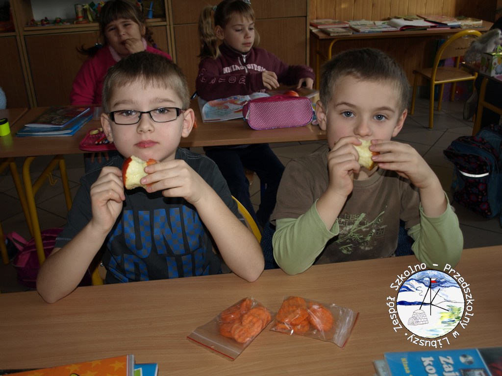 W grudniu klasy IIIa i IIIb zrealizowały zajęcia towarzyszące w ramach programu „Owoce w szkole”, według przygotowanego scenariusza zajęć pt. „Jedzmy zdrowo i kolorowo”. Głównym celem zajęć było poszerzenie wiedzy uczniów na temat wykorzystywania w żywieniu owoców i warzyw oraz utrwalenie zdrowych nawyków żywieniowych. Uczniowie m.in. rozpoznawali owoce i warzywa różnymi zmysłami, poznali wartości odżywcze niektórych produktów spożywczych, wykonali papierowe truskawki metodą orgiami według instrukcji nauczyciela oraz „wesołe” kanapki.